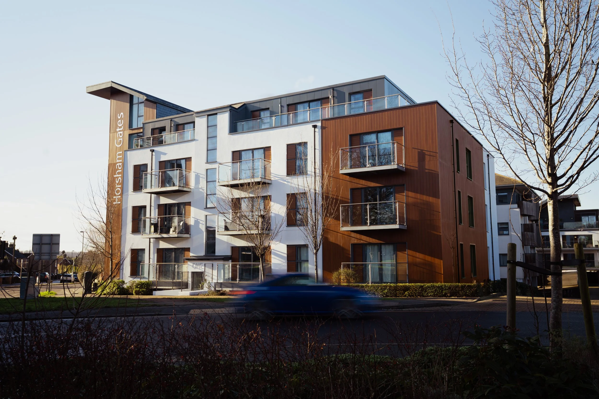 Located within Horsham West Sussex, One Horsham Gate is a five-storey timber framed residential building with under croft parking comprising of 30 one and two bed apartments.